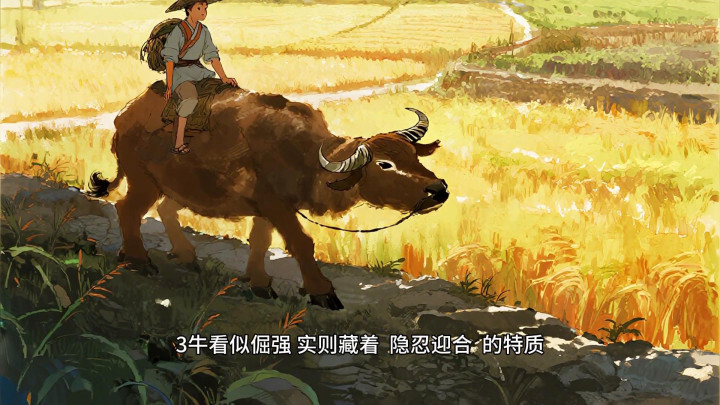 ·3、牛看似倔强,实则藏着隐忍迎合的特质。耕田时顺着主人的鞭子方向走,让往东不往西,哪怕累了也只是慢慢踱步,不违抗指令。就算被拴在柱子上,也只是安静反刍,不吵不闹,靠着顺从主人的意愿换取粮草和容身之地。那股子忍辱负重,顺应他人的劲儿,和偷合取容很贴。